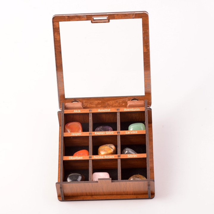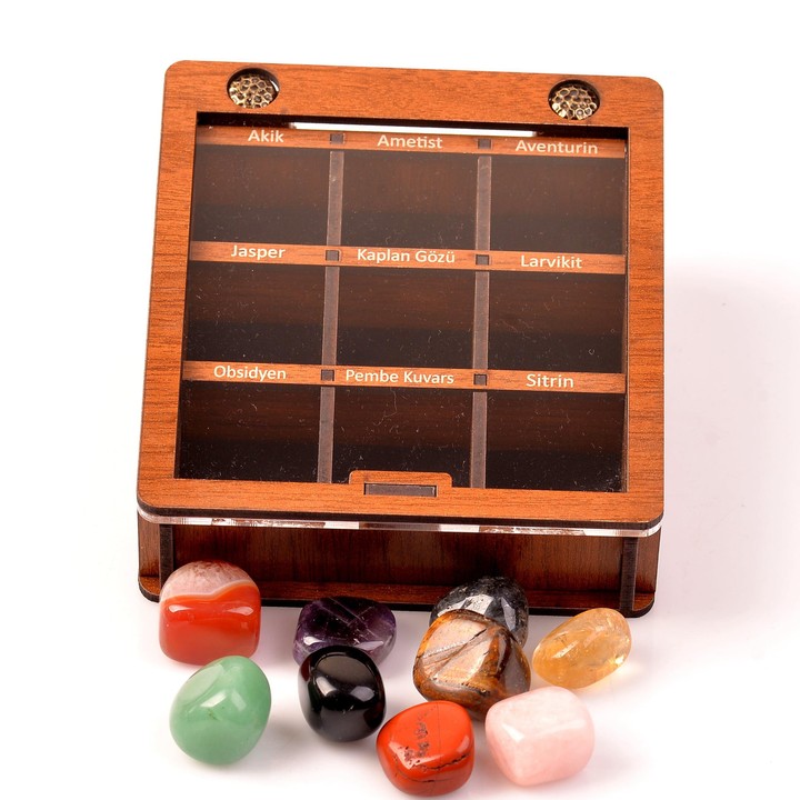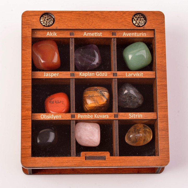 Ahşap Kutu içinde fotoğrafta görünen dokuz adet doğal taş size ulaşacaktır.