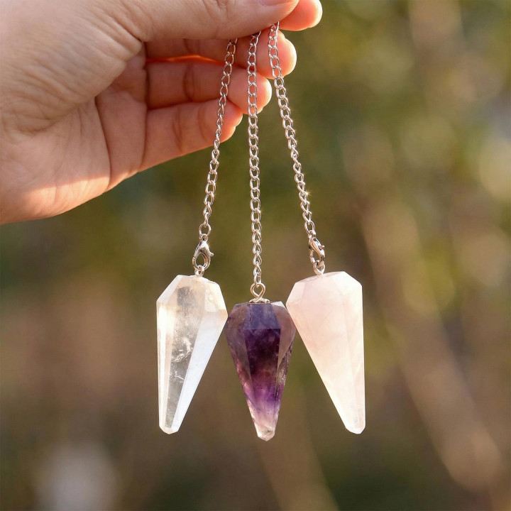 Ametist - Kristal Kuvars - Pembe Kuvars Taşı Sarkaç - Üçlü Pandül Seti, farklı taşların enerjisel sembolizmini bir araya getiren özel bir üçlüdür.