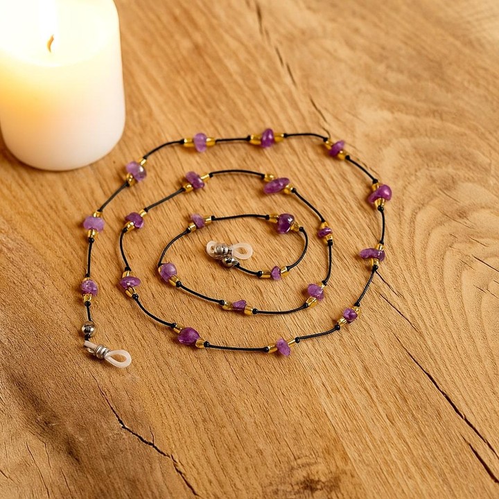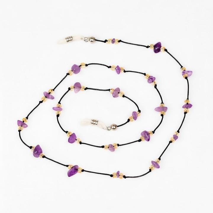 Doğal ametist taşlarından üretilmiş bu zarif gözlük askısı, hem kadın hem erkek kullanıcılar için mükemmel bir seçimdir. Ortalama 75 cm uzunluğundaki ametist gözlük ipi, mor taşların enerjisiyle tarzınıza sofistike bir dokunuş katar.