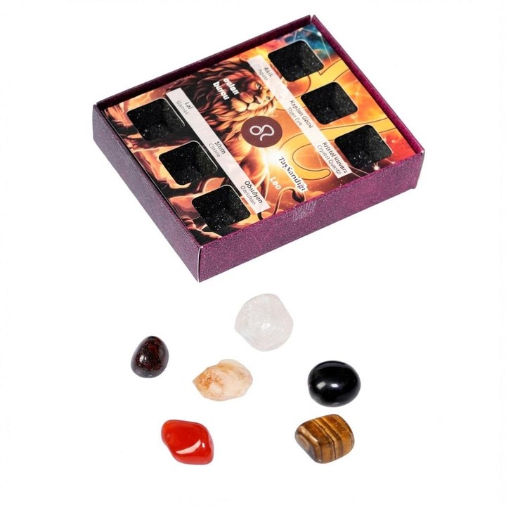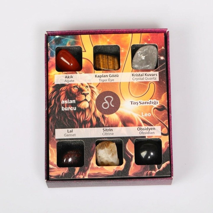Aslan burcunun güçlü, karizmatik ve yaratıcı enerjisini destekleyen 6 özel doğal taş, şık asetat kapaklı özel kutuda bir araya getirildi.