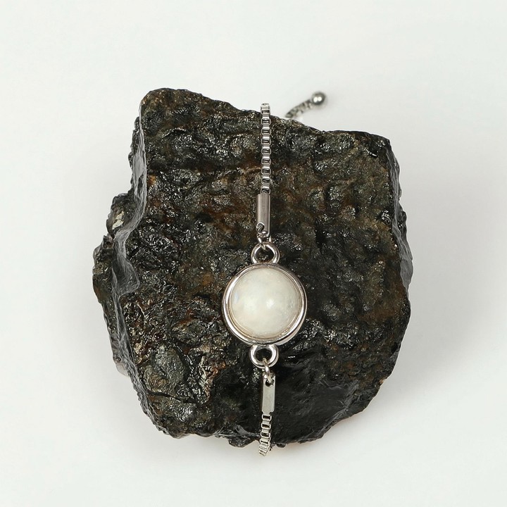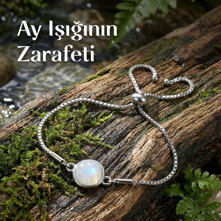 Ay taşı, ışığa göre değişen hareleriyle yüzyıllardır sezgisel dengeyle ilişkilendirilmektedir. Gümüş renkli çelikle birleştiğinde bu mistik taş, dengeli ve etkileyici bir bütünlük oluşturur. Bu bileklik, duygularını bastırmak yerine onları anlamayı ve şifalandırmayı seçen ruhlara hitap eder.