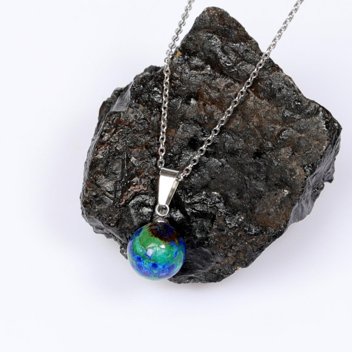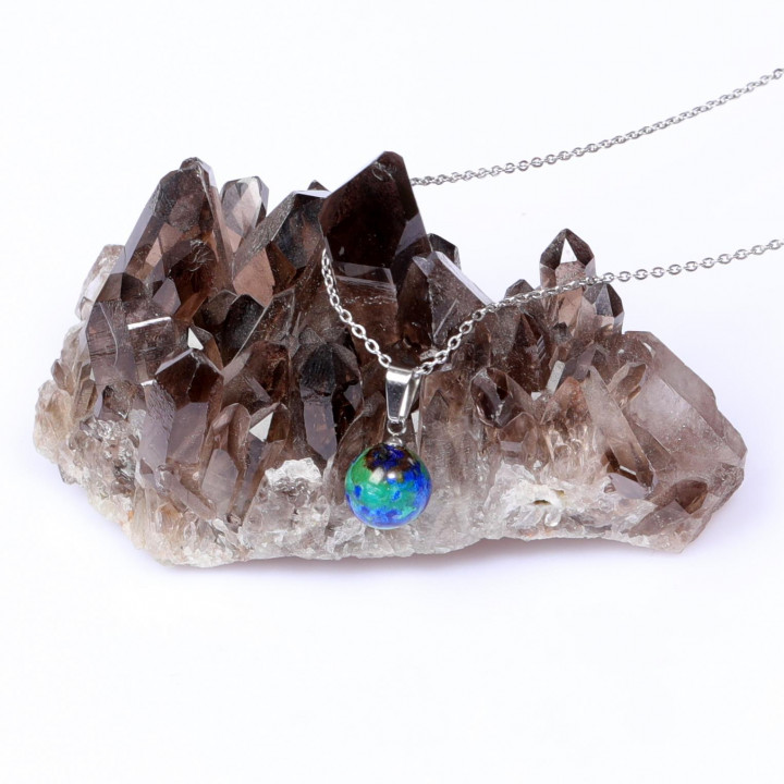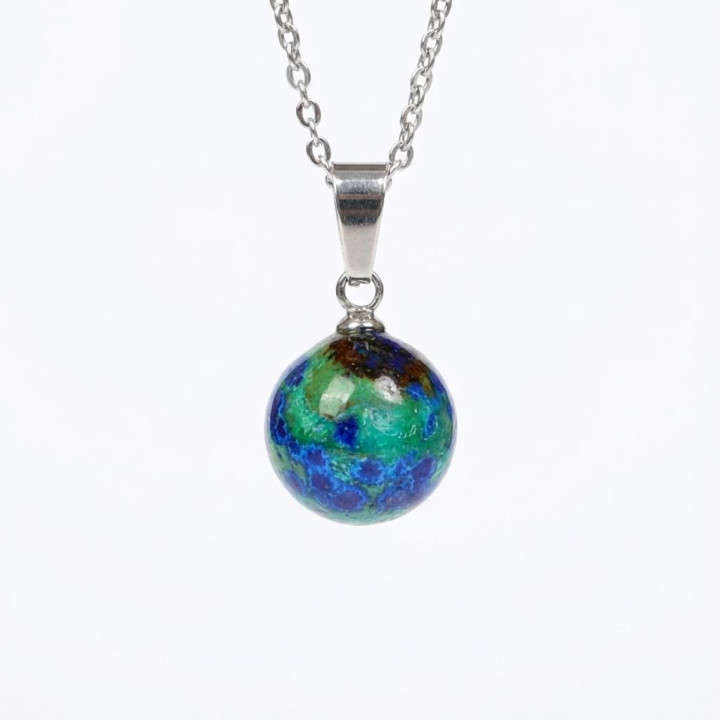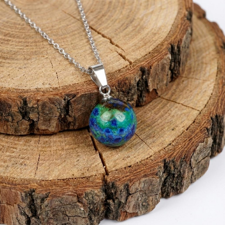 Doğanın derin mavi ve canlı yeşil tonlarını boynunuzda taşıyın. Özenle seçilmiş küre kesim Azurit taşı ve dayanıklı paslanmaz çelik zincirin bir araya geldiği bu özel tasarım kolye, hem günlük kullanım hem de özel günleriniz için zarif ve anlamlı bir aksesuardır. Azurit taşının mistik enerjisini ve estetik duruşunu stilinize yansıtın.