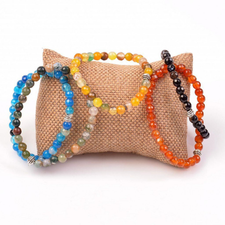 Merhaba, 5 bilekliğin hepsi akik taşlarıdır, mavi ve sarı renkli bileklik akik taşının renklendirilmiş halidir. Turuncu/kahvemsi renkte akik, hint akiki (yeşil renkli bileklik) ve siyah akik bulunur