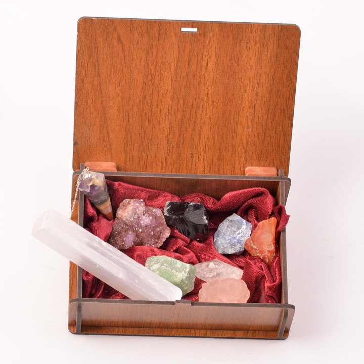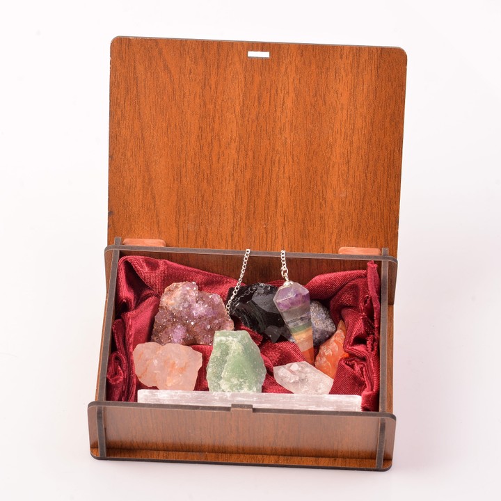 Ahşap kutu içinde fotoğrafta görünen yedi adet ham doğal taş , selenit çubuk ve pandülden oluşan set size ulaşacaktır.