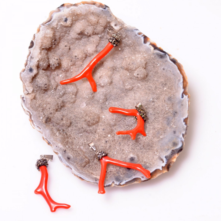 Ürün üzerinde bulunan parlak taşlar hematit taşıdır ve macunlama yöntemiyle mercan ile birleştirilmiştir.