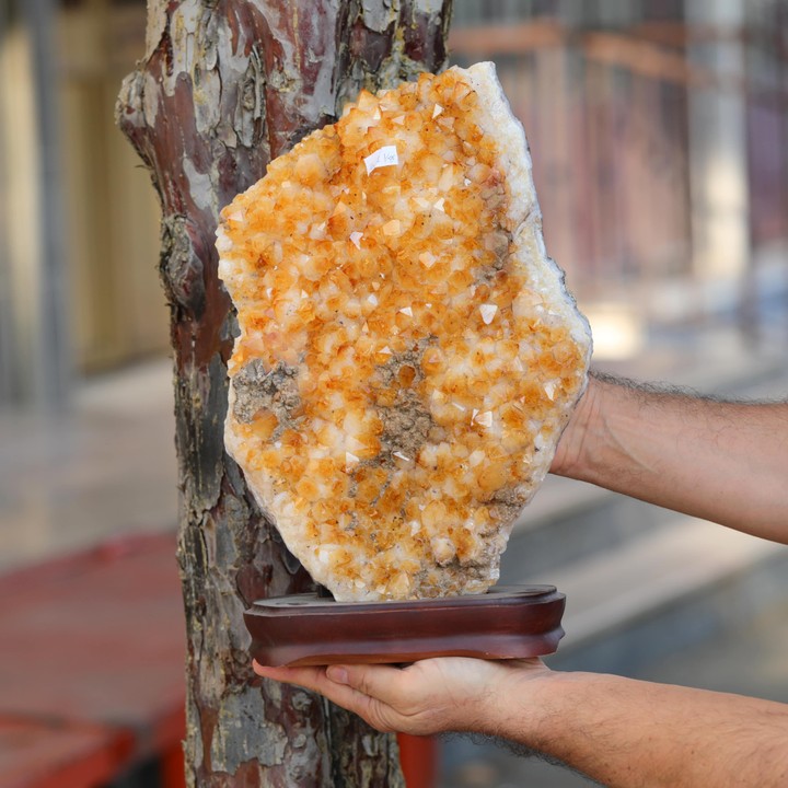 Her bir kristal yüzeyi, ışığı yansıtarak ortama sıcak bir parlaklık kazandırır. Ahşap kaidesi, taşı hem estetik olarak tamamlar hem de güvenli bir şekilde sergilenmesini sağlar.