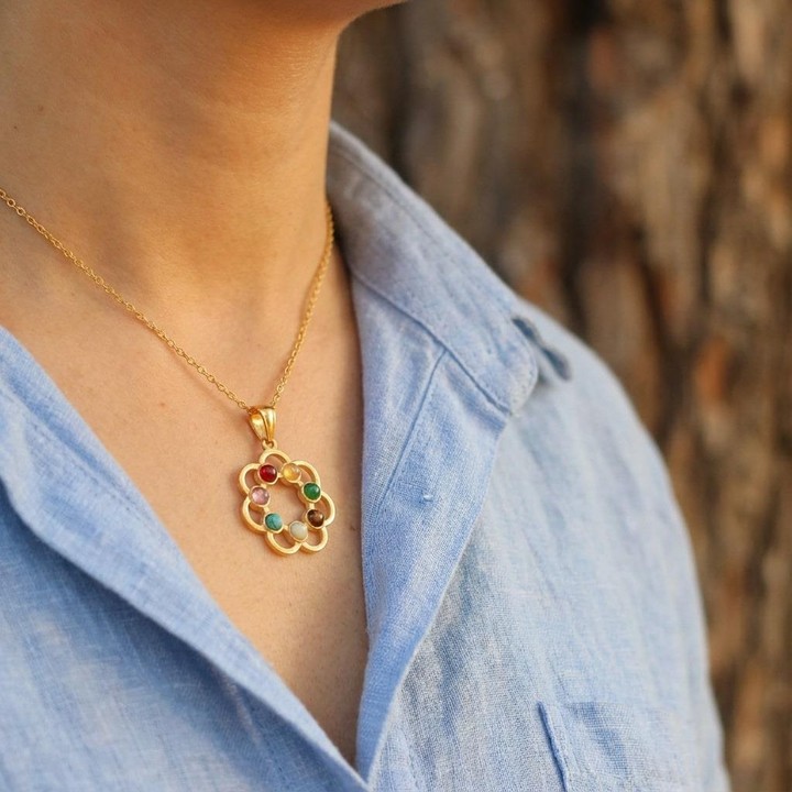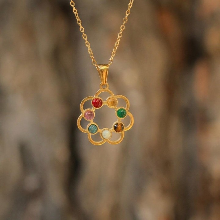 7 farklı doğal taşın enerjisini bir araya getiren Renk Çemberi Çakra Kolye, şık çiçek formu ve renkli taş dizilimiyle hem ruhunuza hem stilinize ışık katar.