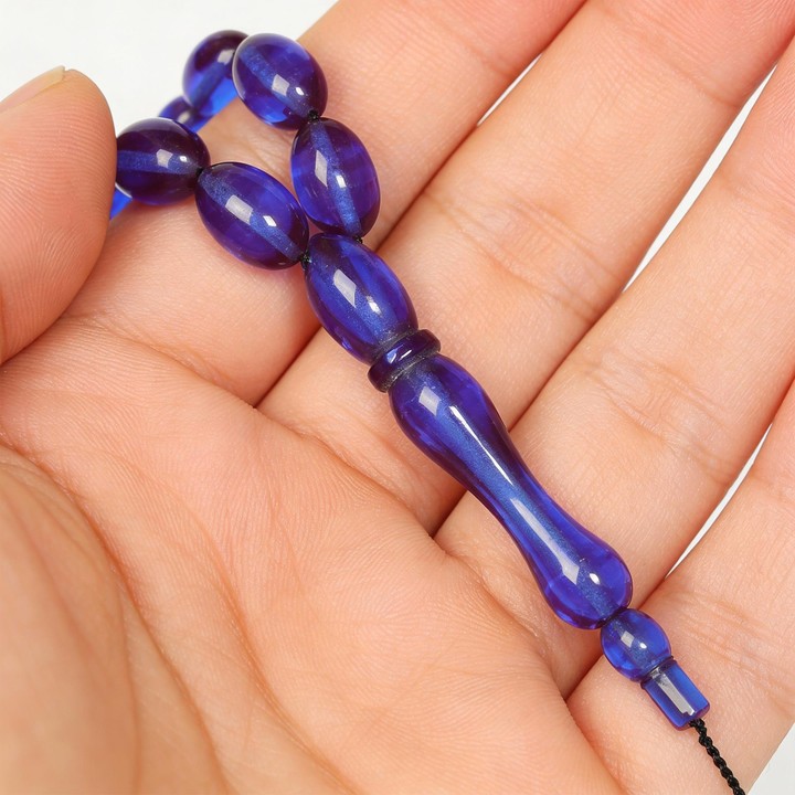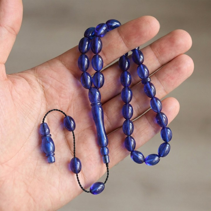 Canlı rengiyle Azure Mavi Sıkma Kehribar Tesbih, ferah bir estetik sunar. Işığı yumuşak biçimde yansıtan yüzeyi, elde akıcı bir temas sağlar.