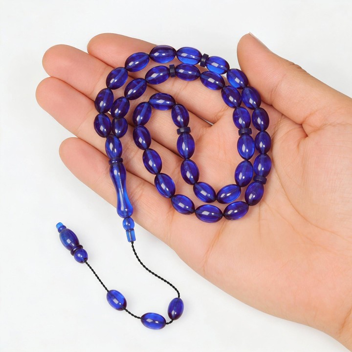 Azure Mavi Sıkma Kehribar Tesbih (7×11 mm)