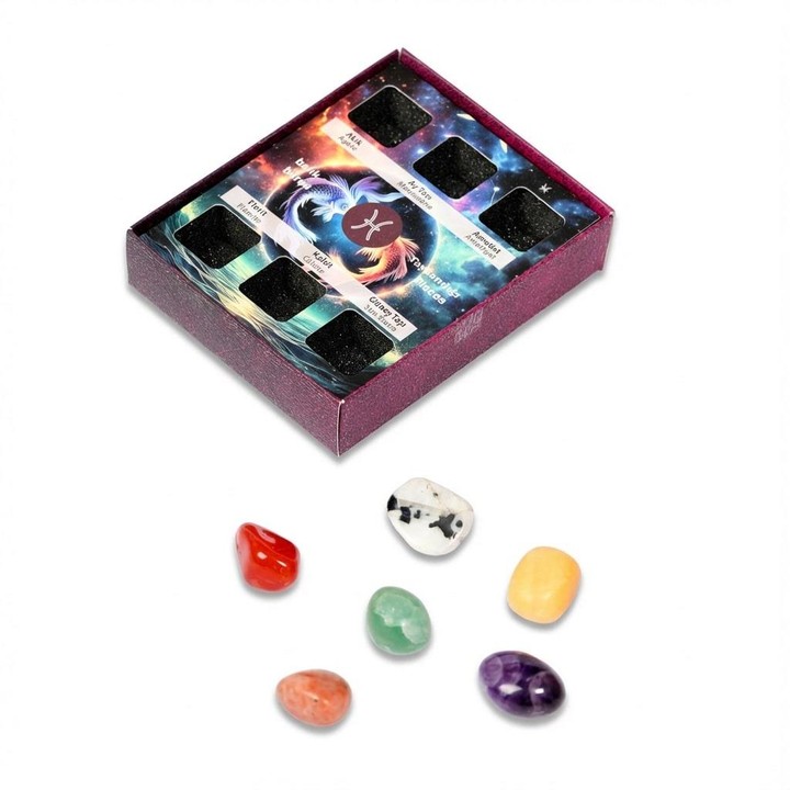 Balık burcunun sezgisel, duygusal ve hassas enerjisini dengeleyen 6 özel doğal taş, şık asetat kapaklı kutusunda bir araya getirildi.