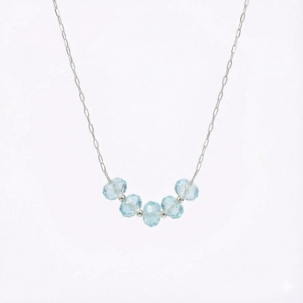 Zarif ve modern tasarımıyla öne çıkan bu mavi topaz kolye, 4×6 mm ebatlarında faset kesim 5 adet mavi topaz taşı kullanılarak hazırlanmıştır. Faset kesim yapısı sayesinde taşlar ışığı etkileyici şekilde yansıtır ve kolyeye canlı bir parlaklık kazandırır.