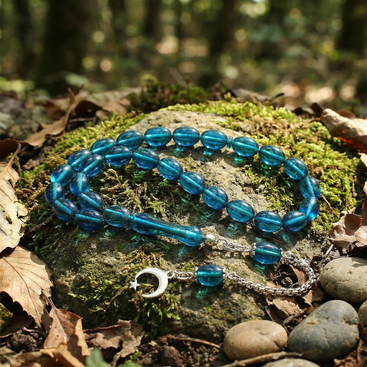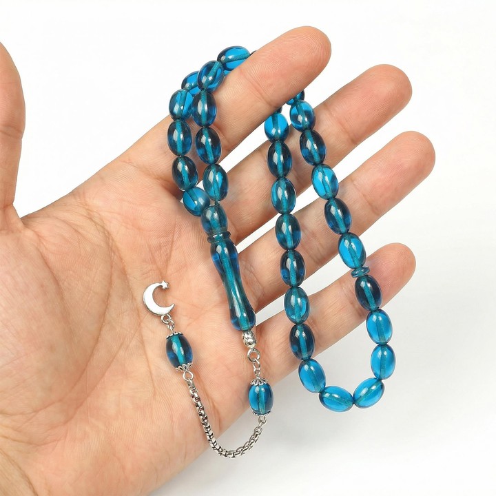 Her bir Gök Mavisi Çelik Püsküllü Sıkma Kehribar Tesbih, yumuşak geçişleriyle sade ama etkileyici bir duruş sergiler. ✨
