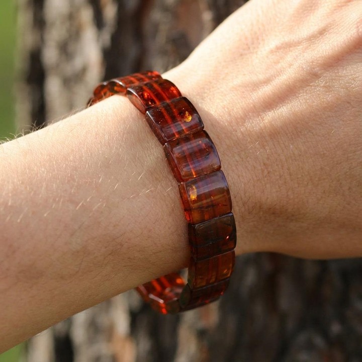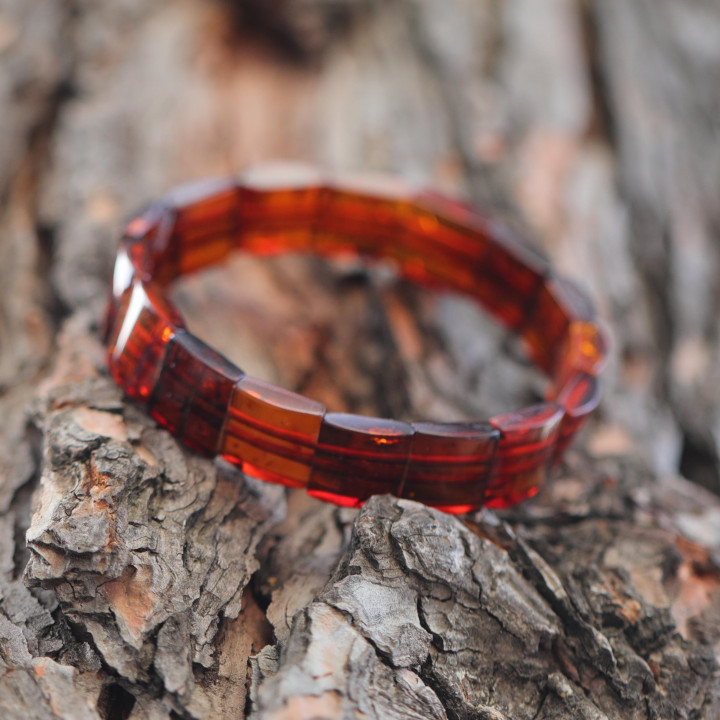 Kare Kesim Baltık Kehribar Bileklik – Doğal Gerçek Kehribar (Elastik) - Konyak Rengi