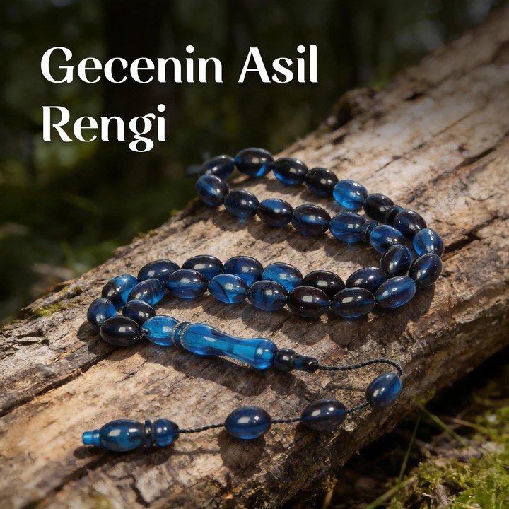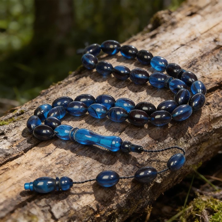 Koyu mavi ve siyah tonlarıyla Mavi-Siyah Sıkma Kehribar Tesbih, güçlü fakat sakin bir duruş sergiler. Renklerin geçişi, tesbihe ağırbaşlı bir karakter kazandırır.