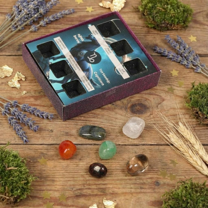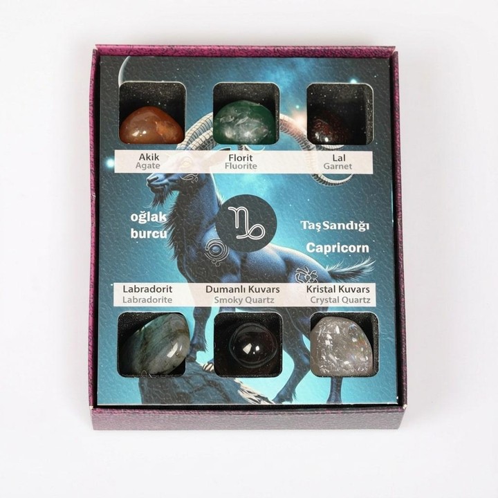 Oğlak burcunun enerjisini destekleyen 6 farklı doğal taş, şık asetat kapaklı özel kutuda bir araya getirildi.
