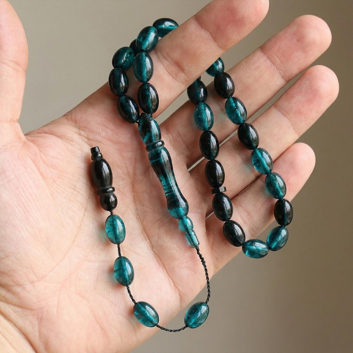 Turkuaz tonların siyah zeminle dengelendiği Turkuaz Rengi-Siyah Sıkma Kehribar Tesbih, elde net ve karakterli bir duruş sergiler. Renklerin kontrastı, tesbihe modern ve ölçülü bir ifade kazandırır.