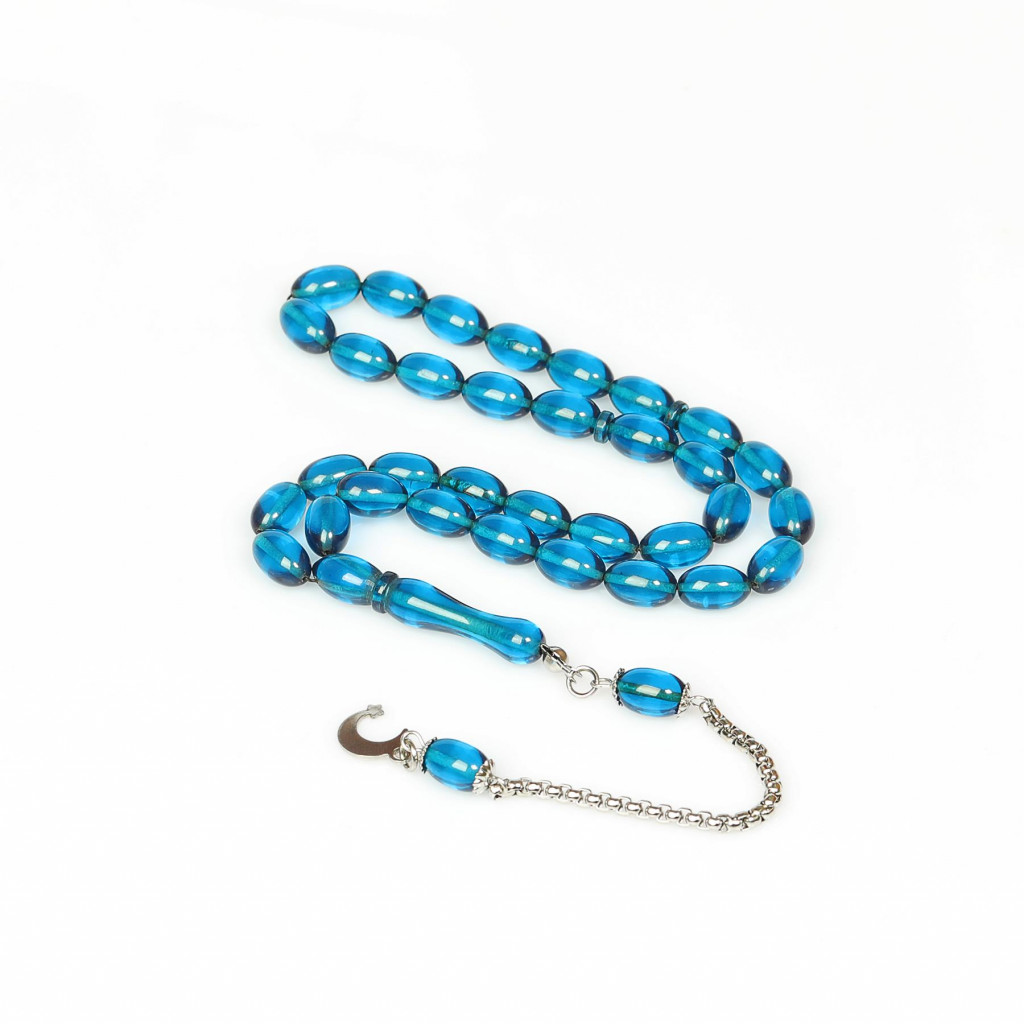 Gök Mavisi Çelik Püsküllü Sıkma Kehribar Tesbih (7*11 mm)