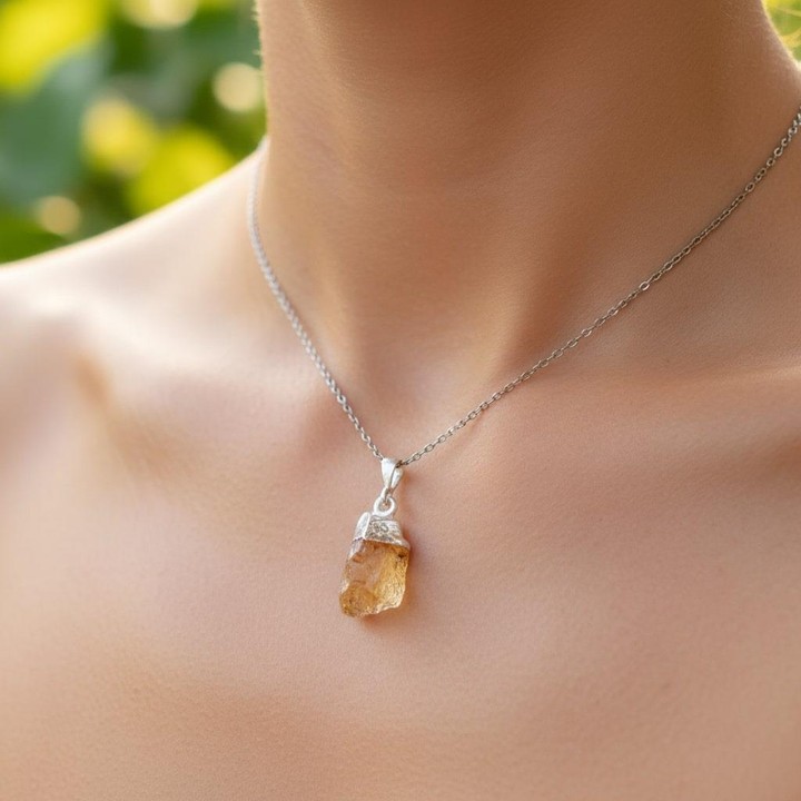Gerçek doğal sitrin taşı ile hazırlanmış bu zarif kolye, hem şık görünümü hem de anlamı ile öne çıkar.