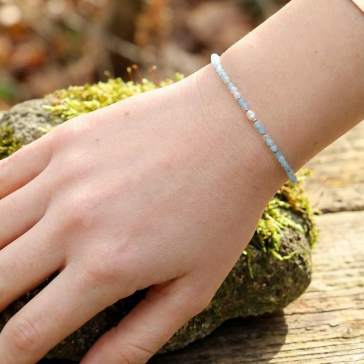 3 mm doğal akuamarin taşı kullanılarak tasarlanan bu özel bileklik, ortasında yer alan gerçek inci detayı ile sade şıklığı zarafetle buluşturur. İnce yapısı sayesinde bilekte hafif ve estetik bir duruş sergiler; günlük kullanımdan özel davetlere kadar her stile uyum sağlar.
