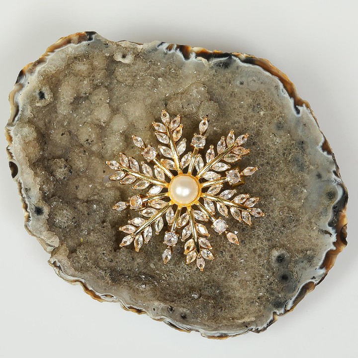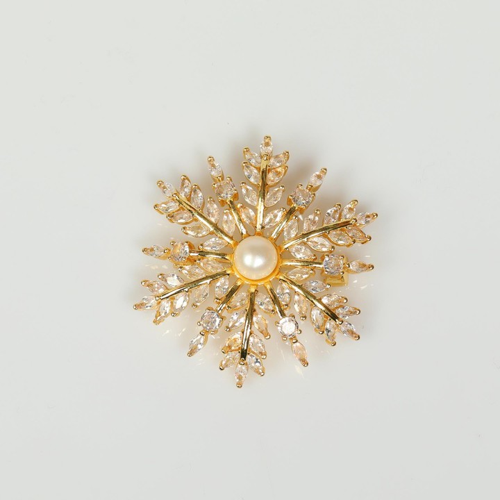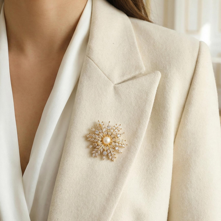 Kar tanelerinin saflığı ve incinin zarif ışıltısı, altın rengin sıcak dokusu ile birleşerek eşsiz Kar Tanesi Şeklinde İncili Altın Renk Broş tasarımını ortaya çıkarıyor.