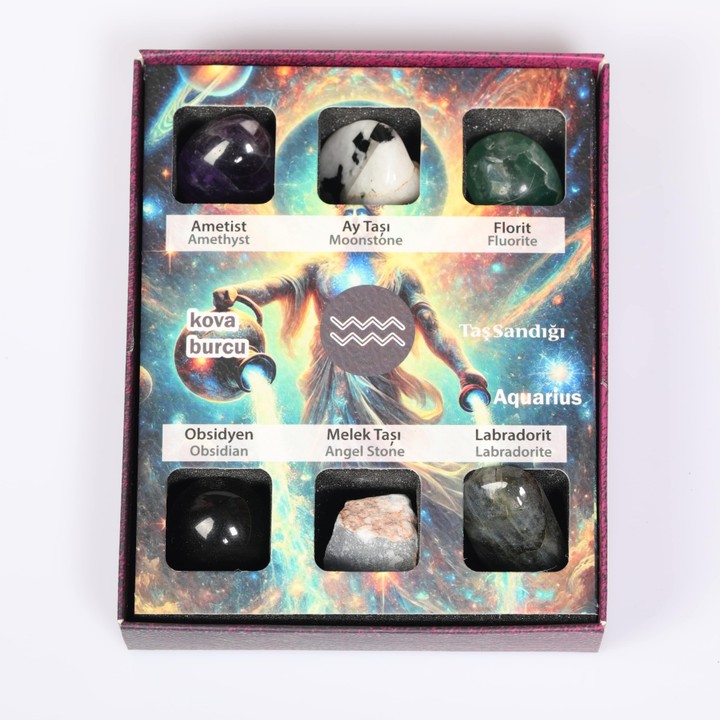 Kova burcunun özgün, yenilikçi ve zihinsel enerjisini destekleyen 6 özel doğal taş, şık asetat kapaklı kutusunda bir araya getirildi.
