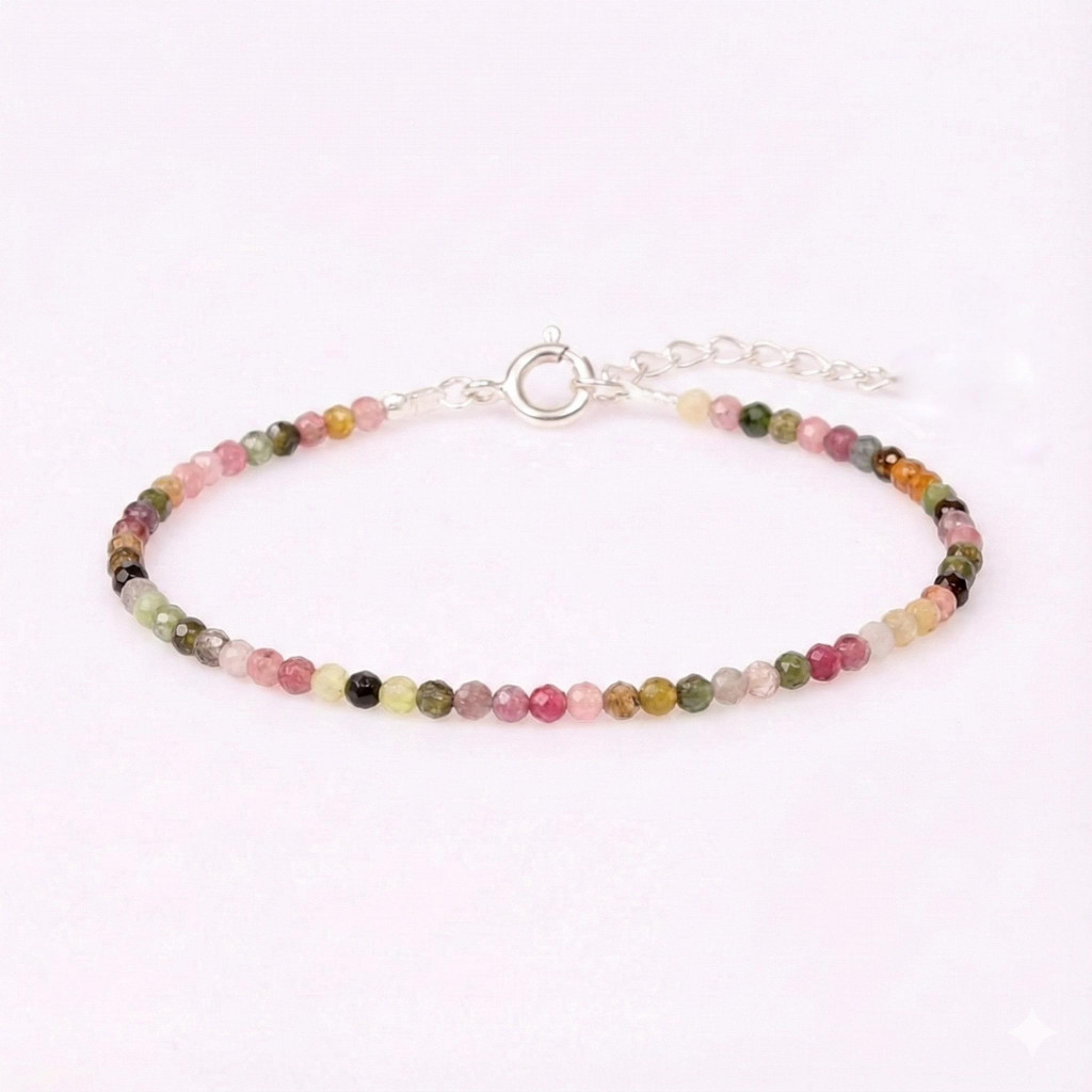 Ortalama 2,8 mm faset kesim doğal turmalin taşları ile hazırlanan bu özel bileklik, turmalinin kendine özgü multi renk yapısı sayesinde enerjik ve sofistike bir görünüm sunar. Yeşil, pembe, kahverengi ve koyu tonların doğal geçişleri her bilekliği benzersiz kılar.
