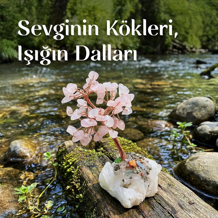 Pembe Kuvars Taşı Ağaç, bakır tel ile şekillendirilmiş dalları ve tabanındaki kristal kuvars taşı ile güçlü bir bütünlük sunar. Dallarda yer alan pembe kuvars taşı, yumuşak pembe tonlarıyla sevgi temasını simgelerken; tabandaki kristal yapı ışık enerjisini temsil eder.