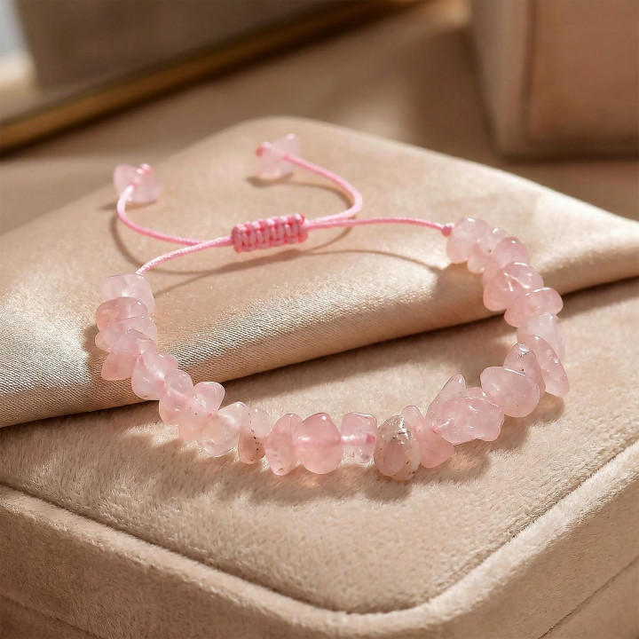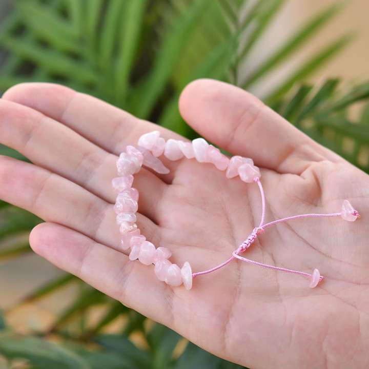 Pembe Kuvars Taşı Bileklik – Ayarlamalı, dengeli dizilimiyle hem estetik hem konforlu bir kullanım sunar. İnce ve düzenli sıralanan pembe kuvars taşı, bilekte temiz ve rafine bir görünüm oluşturur.