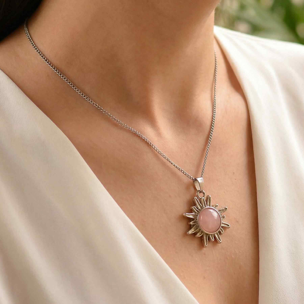 Pembe Kuvars Taşı Güneş Kolye, merkezindeki pembe kuvars taşı ile çevresindeki güneş formunun güçlü sembolizmini bir araya getirir.