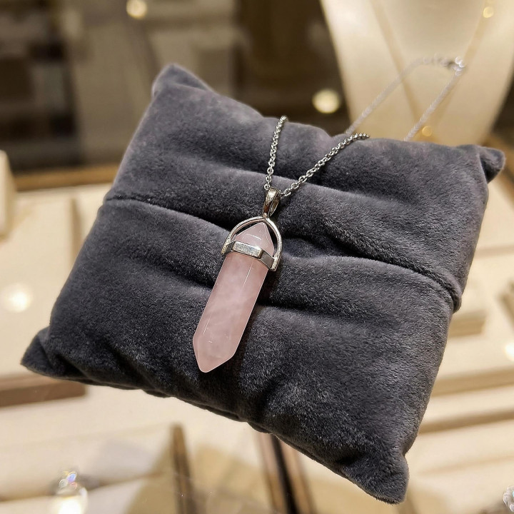 Pembe Kuvars Taşı Kalem Kolye, uzun ve zarif formuyla hem modern hem sembolik bir tasarım sunar. İnce silueti sayesinde pembe kuvars taşı, boyun hattında dikkat çekici bir çizgi oluşturur.