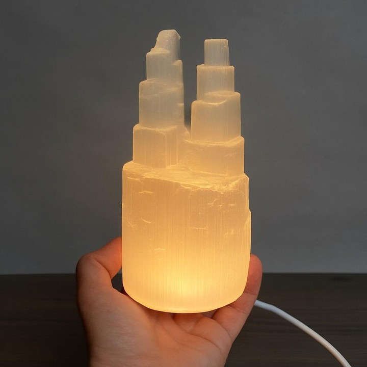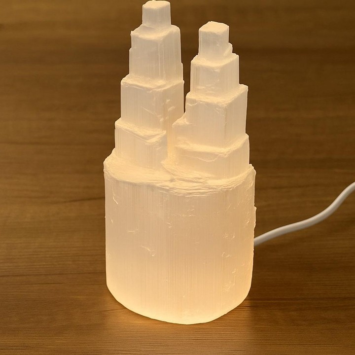 Bu özel tasarım selenit ikiz kule lamba, tamamen doğal selenit taşından el ile şekillendirilmiş olup, her biri kendine özgü doku ve ışıltıya sahiptir. Ortalama 8 x 11 cm taban ve 20 cm yükseklik ölçülerine sahip olan bu lamba, hem dekoratif hem işlevsel bir parçadır.