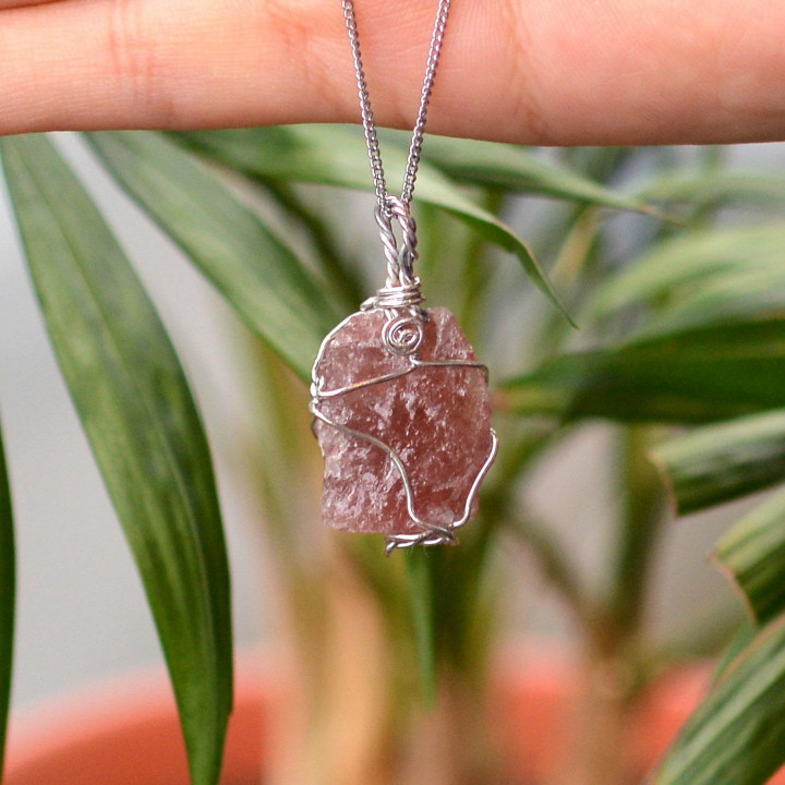 Ham Çilek Kuvars Taşı Kolye - Tel Sargılı