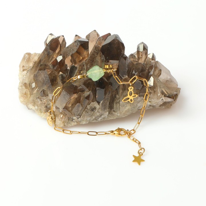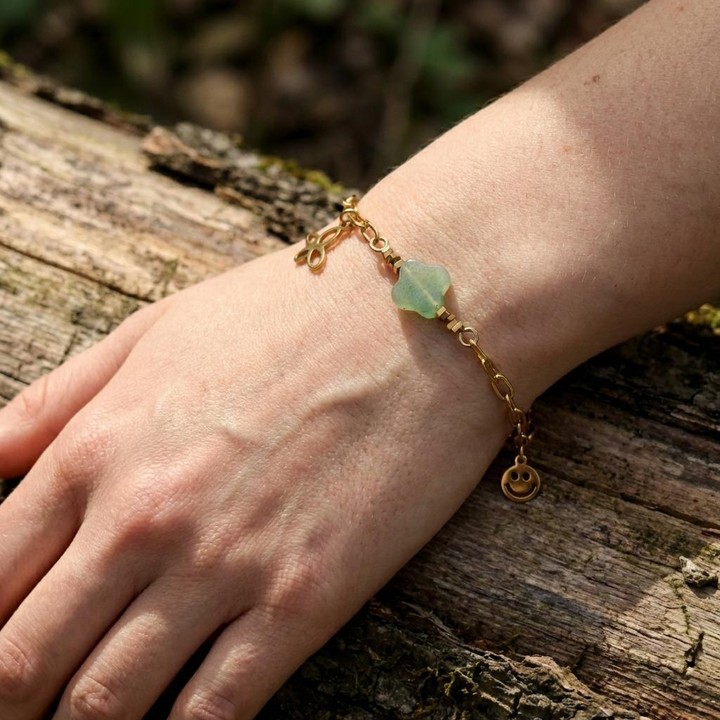 Doğanın enerjisini ve şansın sembolünü bileğinizde taşıyın! Yeşil Çilek Kuvarsı (Green Strawberry Quartz) taşının huzur veren rengi, dört yapraklı yonca formuyla birleşerek hem modern hem de zarif bir aksesuar sunuyor.