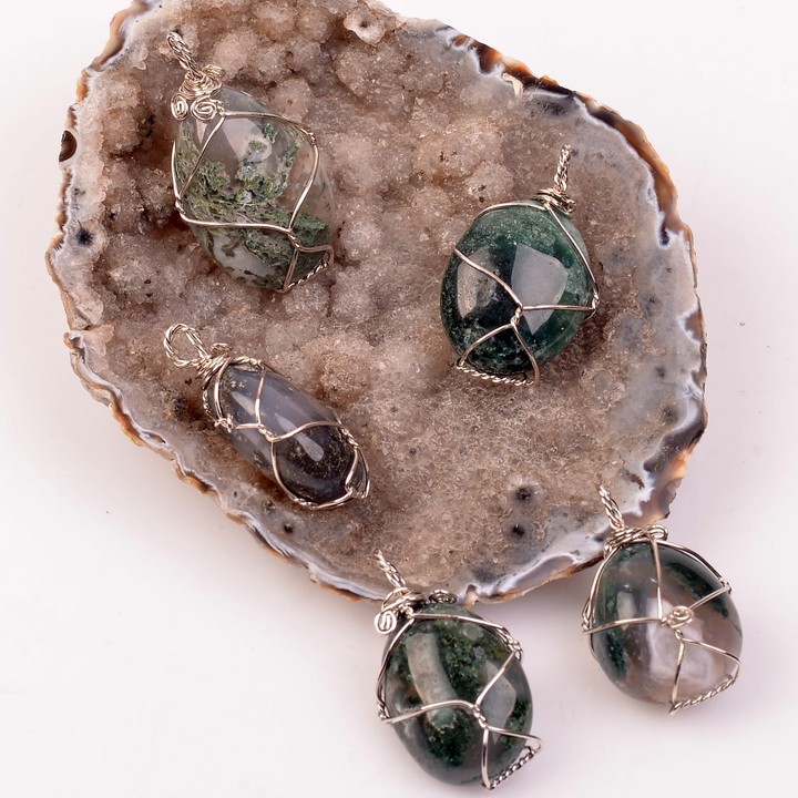 Yosunlu Akik Taşı Kolye - Tel Sargılı